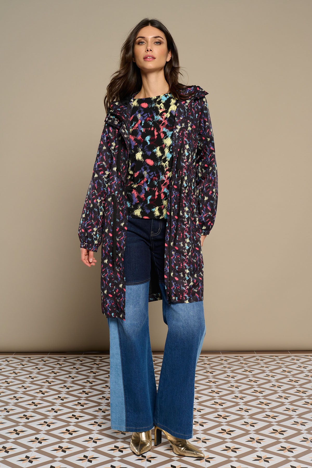Chaqueta impermeable con estampado original y con toques de colores intensos que transforma los días grises en días a todo color.