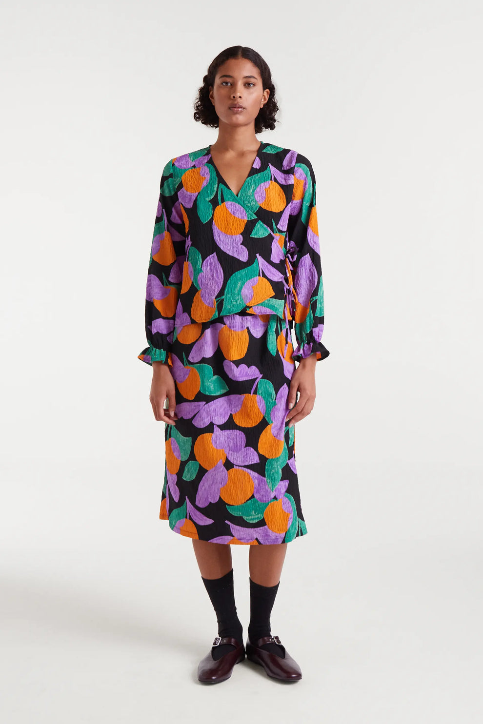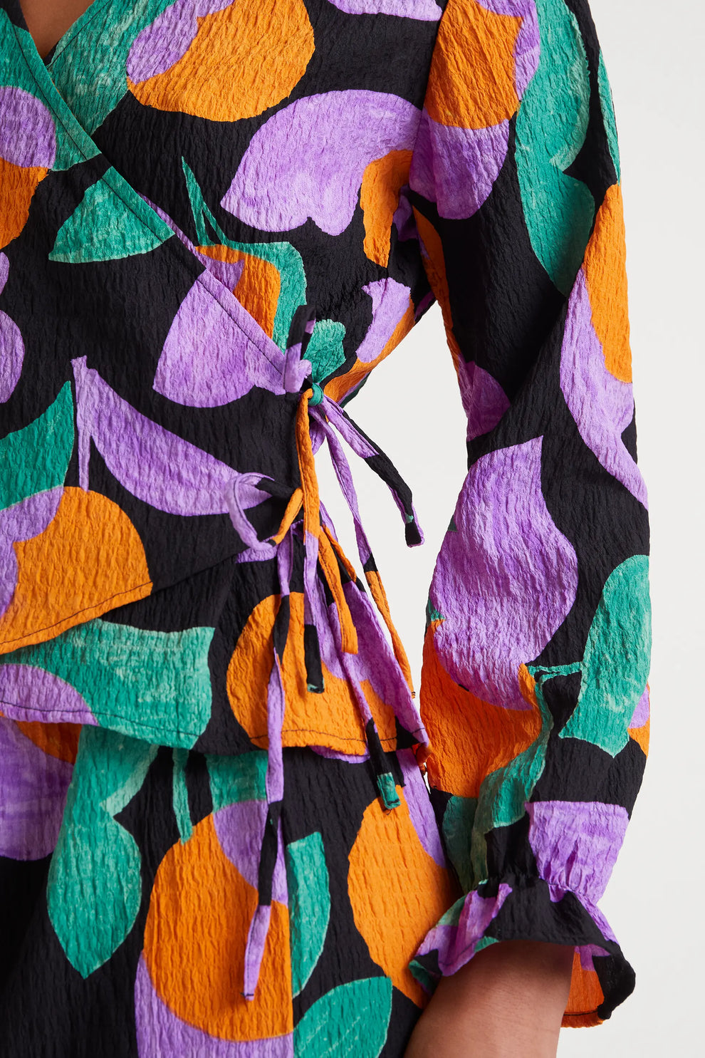 Blusa de corte cruzado de tejido de bámbula y lazada lateral y puños en volantes elásticos
