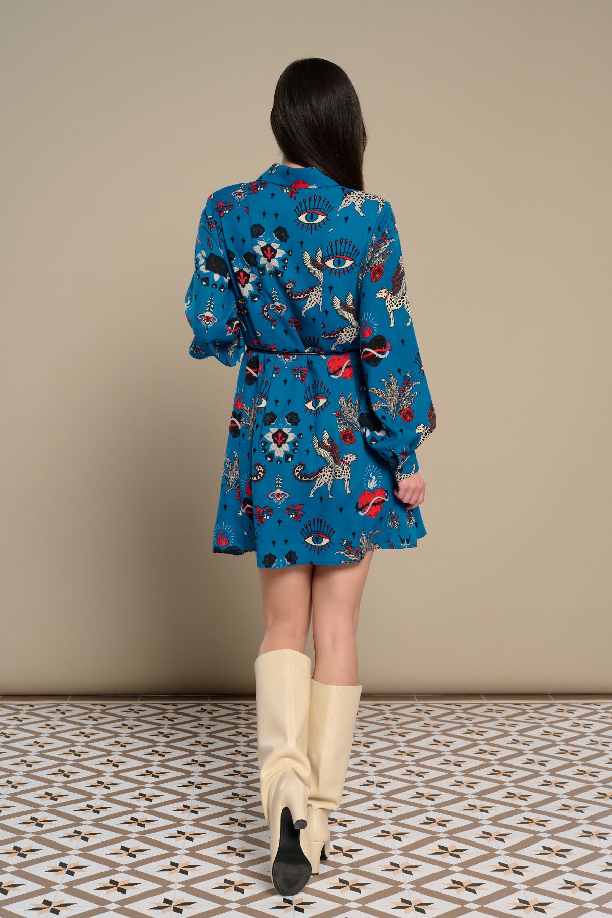 Vestido camisero corto con estampado vibrante, viene incluido cordón para ajustar cinturilla.