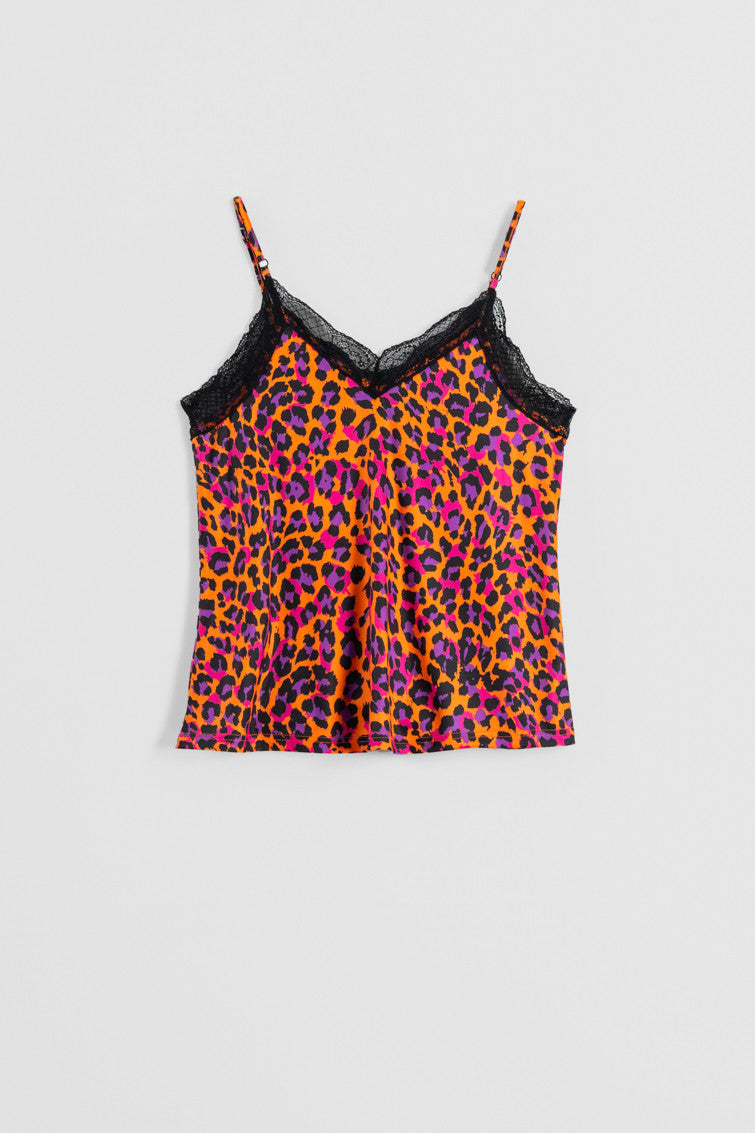 Lencera de tejido elástico y puntilla negra,su estampado de leopardo en tonos fluorescentes harán que no pases desapercibida