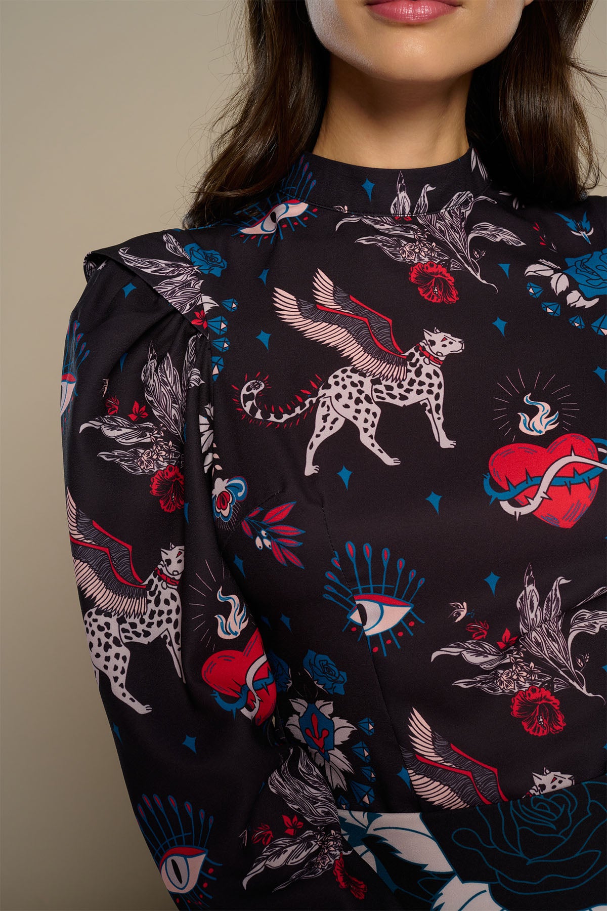 Blusa de tejido ligero y botón trasero. Su manga abullonada y su diseño hacen una pieza perfecta para una ocasión especial.