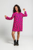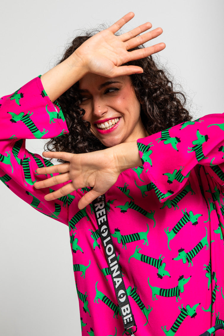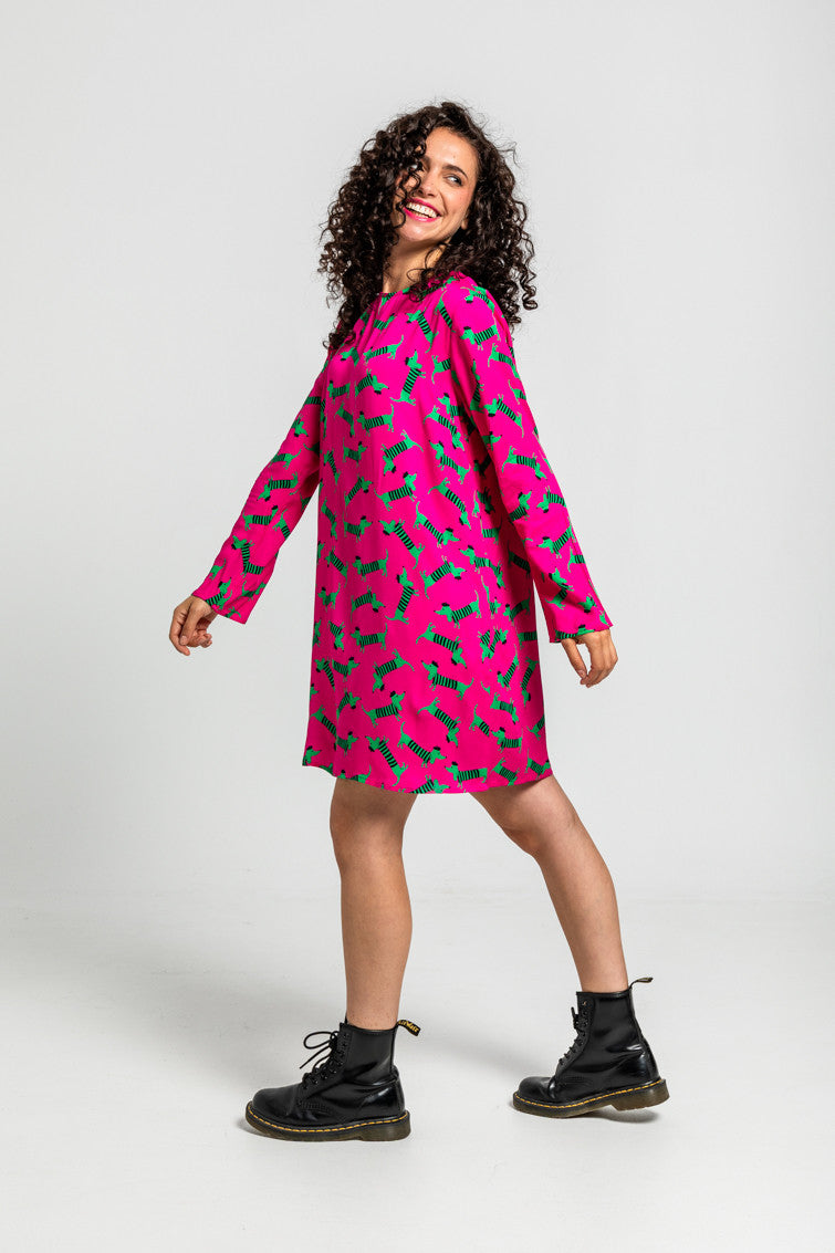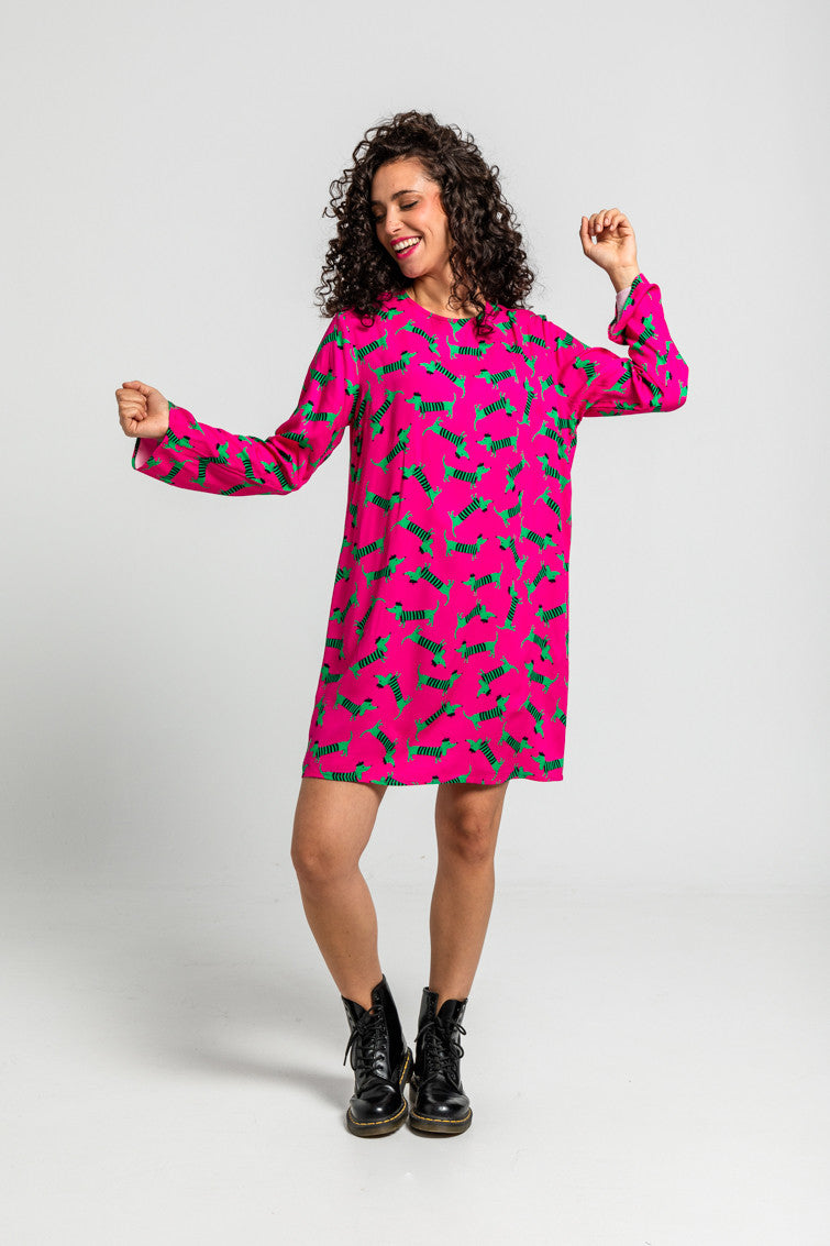 Vestido corto de manga baja y corte évase con tejido ligero y estampado de perrito salchicha