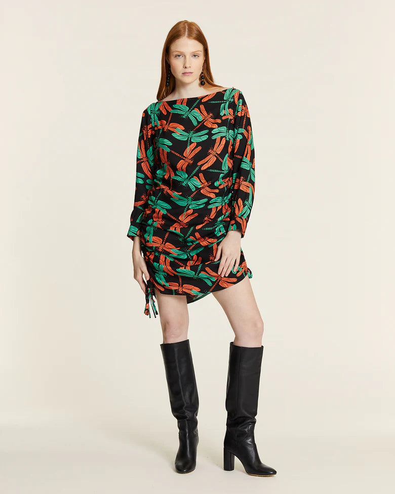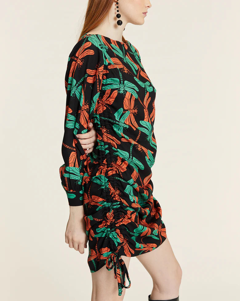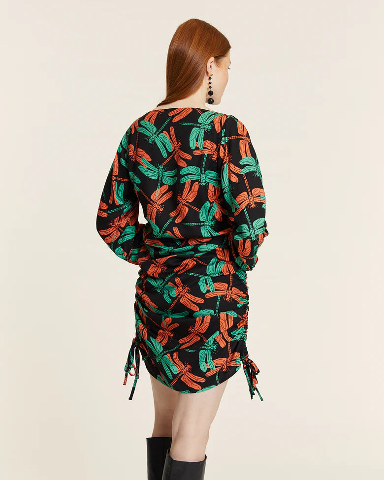 Vestido libélulas con puños bandent, mangas largas bishop y detalles fruncidos que aportan un toque sofisticado y único a tu look.